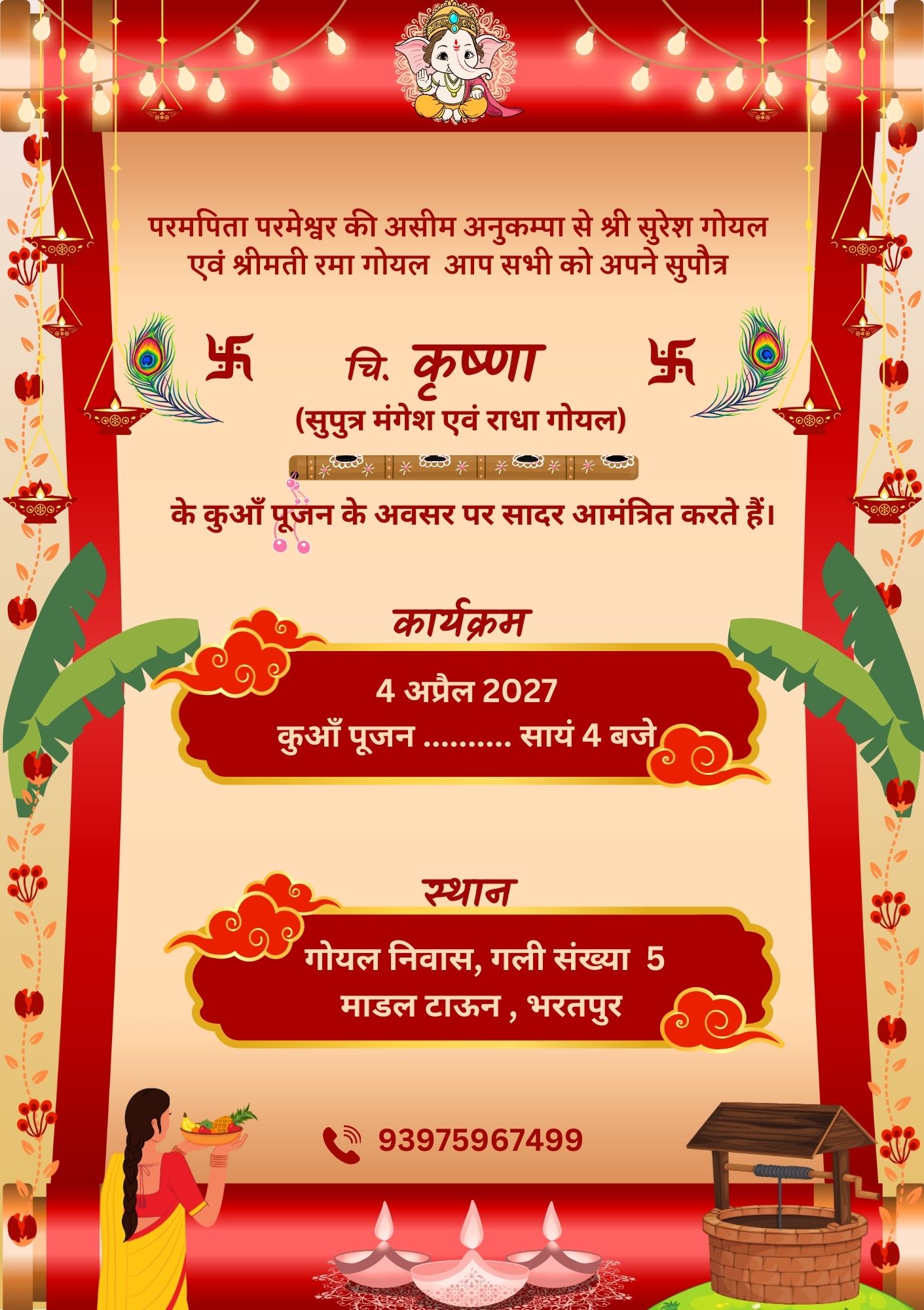This amazing kuan poojan invitation is in Hindi language. It is decorated with red flowers, banana leaves, peacock feathers, hanging lights & well/kuan. There is also picture of mother performing Kuan Pujan.