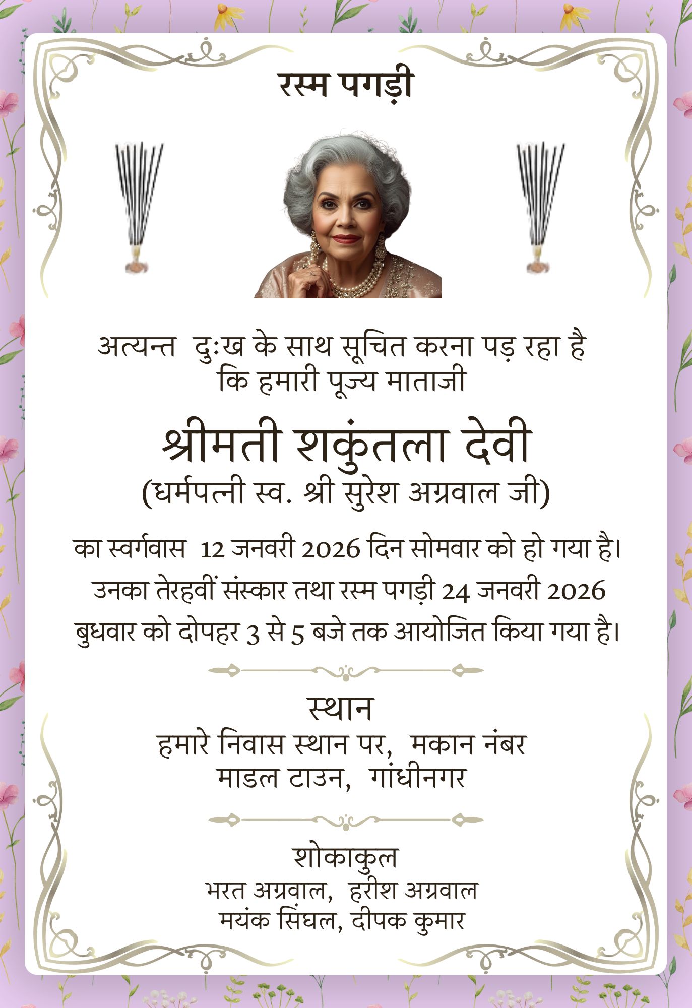 Create this Rasam Pagdi invitation in Hindi language . It is decorated floral background. The incense sticks are also added. You can add the photo of the person also.